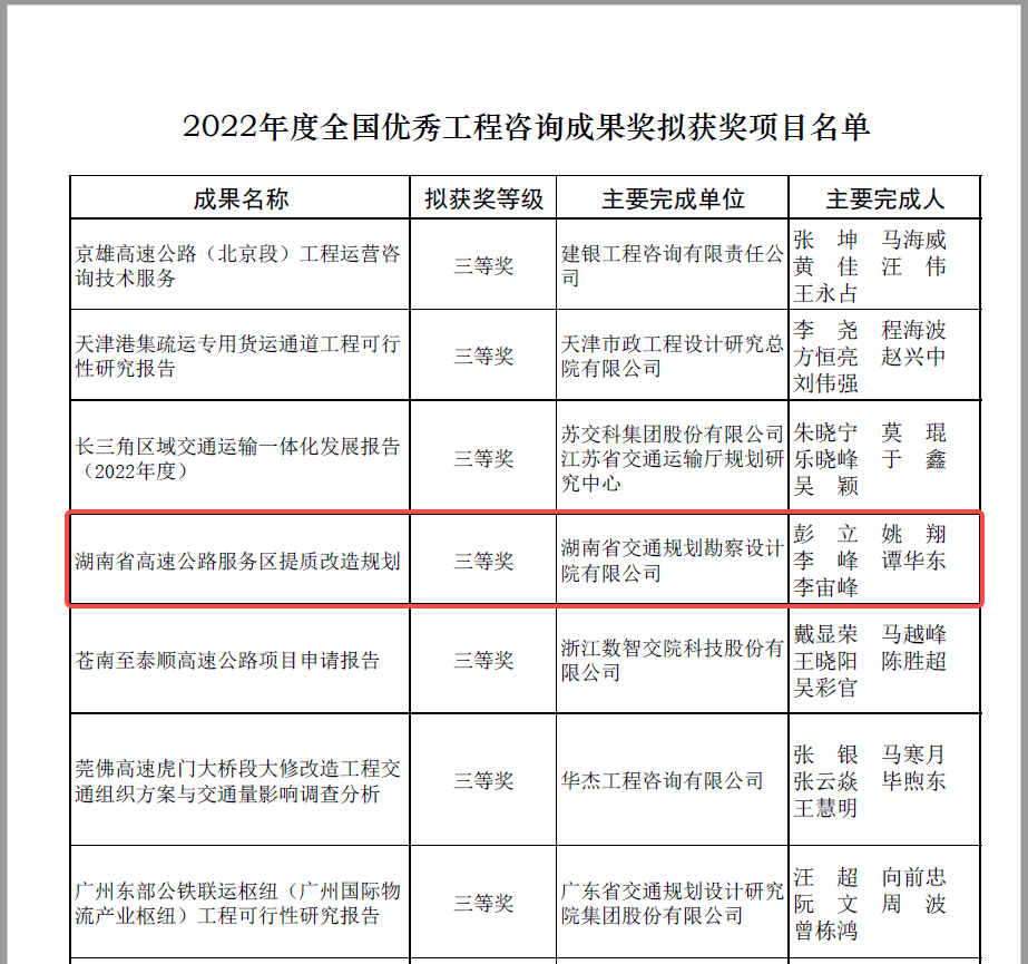 MORE近日,中國工程咨詢協會公布了2022年度全國優秀工程咨詢成果獎獲獎項目名單,湖南交通設計院編制的《湖南省高速公路服務區提質改造規劃研究》喜獲殊榮。 全國優秀工程咨詢成果獎,是國內工程咨詢領域的最高榮譽,旨在表彰和獎勵在我國工程咨詢業務實踐中作出突出貢獻的集體...