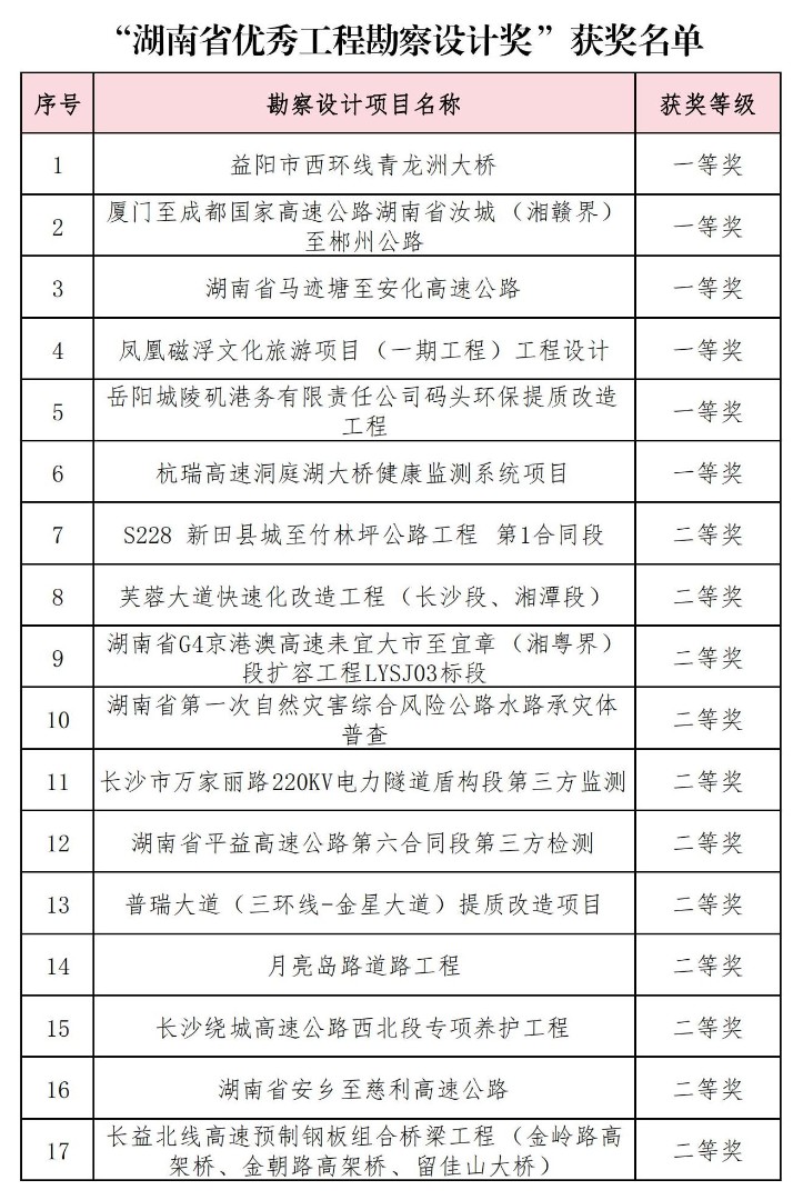 MORE1月24日,湖南省勘察設計協會公布了2023年度湖南省優秀工程勘察設計獎評選結果。湖南交通設計院26個項目脫穎而出,共攬獲一等獎6項、二等獎11項、三等獎9項,獲獎數量創歷史新高!獲獎項目涵蓋道路、市政工程、水運勘察、市政公用工程設計、建筑工程設計、交通工程等多個領域...
