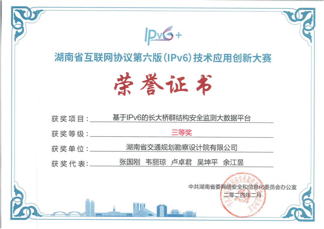 2月1日,由湖南省委網信辦主辦的湖南省互聯網協議第六版(IPv6)技術應用創新大賽頒獎儀式在長沙舉行,湖南交通設計院開發的“基于IPV6的長大橋群結構安全監測大數據平臺”喜獲大獎。 IPV6為下一代IP協議,其數據傳輸安全性、傳速效率等優于IPV4,是互聯網演進升級的必然趨勢、...