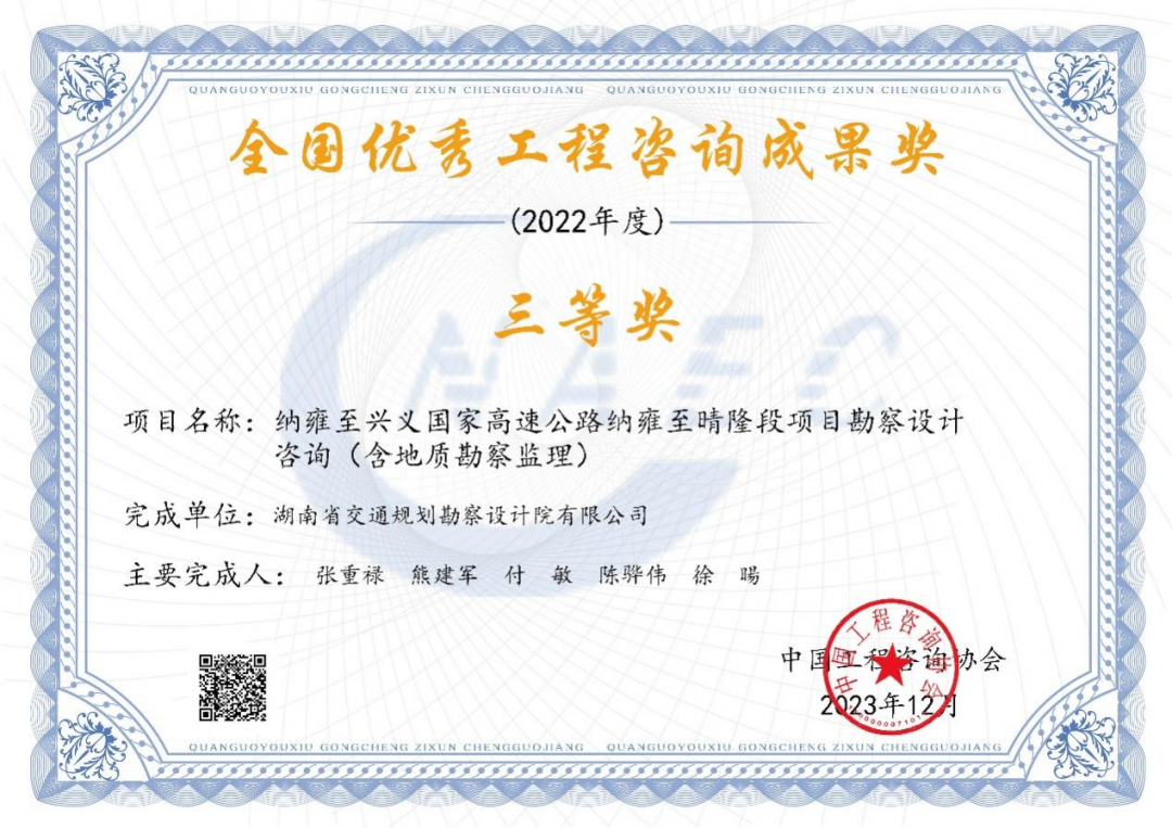 MORE近日,中國工程咨詢協會公布2022年度全國優秀工程咨詢成果獎獲獎項目,湖南交通設計院承擔的納雍至興義國家高速公路貴州省納雍至晴隆段勘察設計監理咨詢榮獲全國優秀工程咨詢成果獎。 全國優秀工程咨詢成果獎是工程咨詢行業的最高獎項,旨在表彰和獎勵在我國工程咨詢業務...